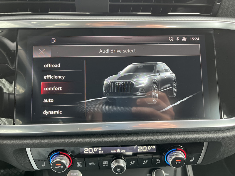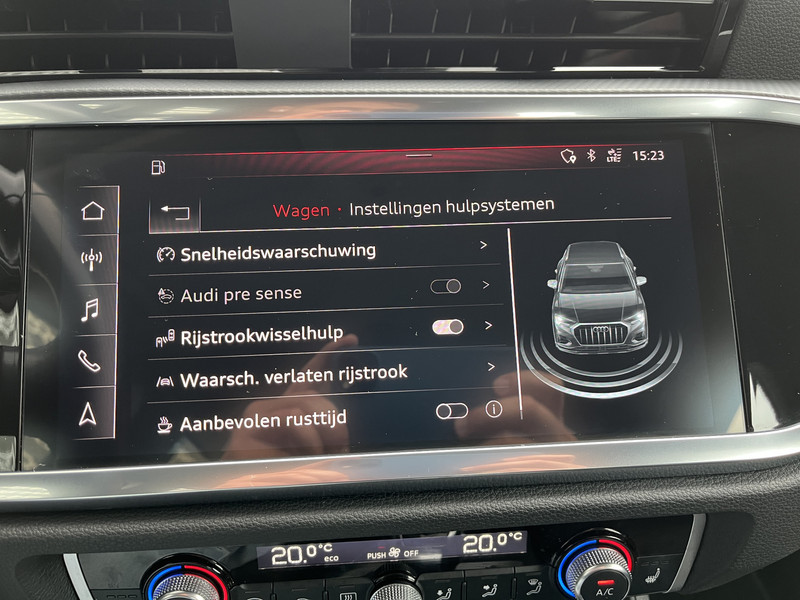 Zoals je mag verwachten van deze Audi Q3 is hij uitgerust met een reeks aan actieve veiligheidssystemen. Met het Lane-keeping systeem ga je nooit onbedoeld over de streep. Forward collision warning waarschuwt bij een dreigende aanrijding en vermindert de gevolgen van een ongeval. De veiligheid van deze auto wordt verder verhoogd door dodehoekdetectie, hill hold functie, autonoom remsysteem en bandenspanningcontrolesysteem.
