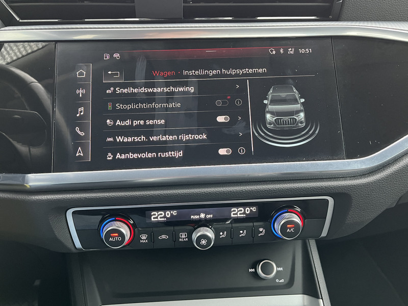 In de Audi Q3 heeft jouw veiligheid en die van jouw omgeving prioriteit. Dat de auto steeds meer taken van de bestuurder overneemt, merk je bijvoorbeeld aan het systeem voor verkeersbord-detectie in deze Audi. Forward collision warning waarschuwt voor een kop-staart botsing. Ook helpen het hill hold functie, autonoom remsysteem en bandenspanningcontrolesysteem, jouw rit tot een veilige rit te maken.