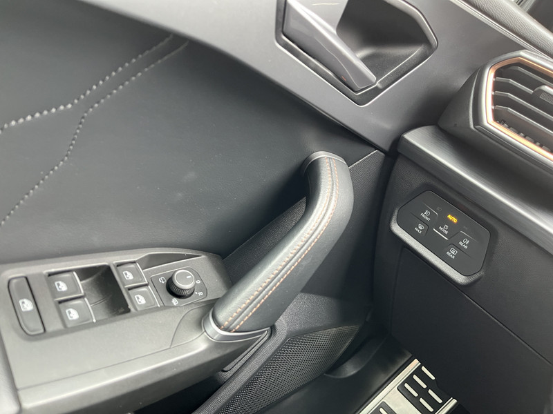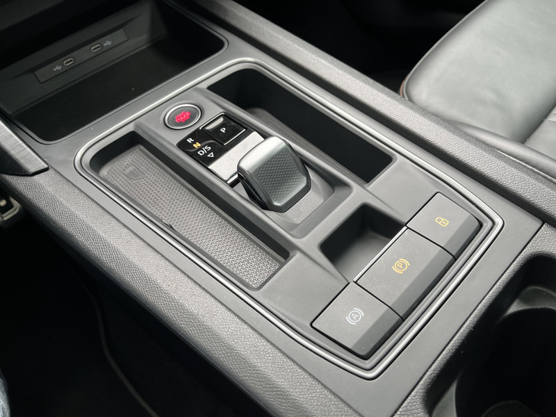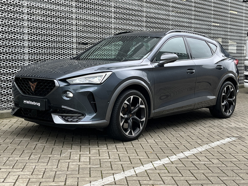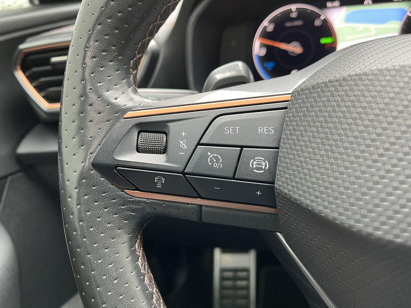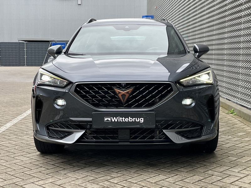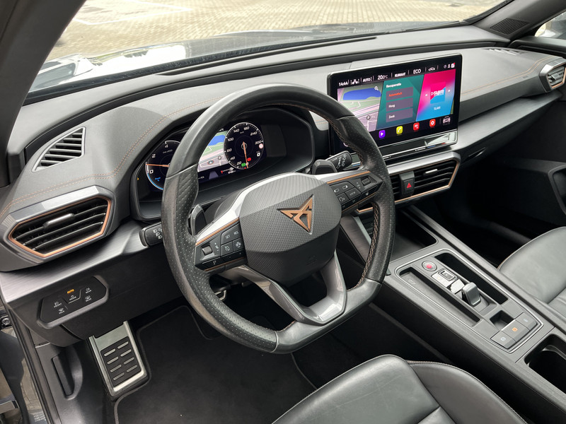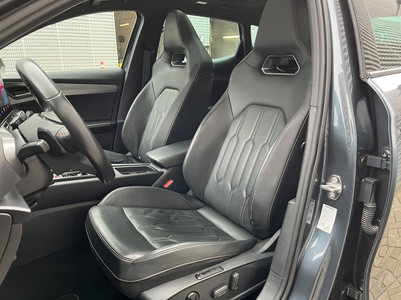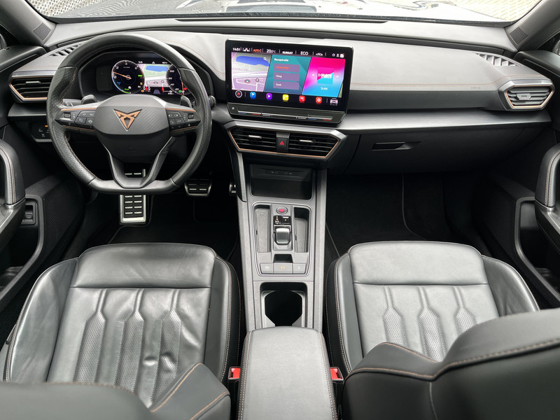 Voor deze CUPRA Formentor moet je snel zijn, want die gaat aandacht krijgen. Net binnen, maar daar blijft-ie niet lang! De hybride motor combineert een elektromotor met een verbrandingsmotor. Je kan dus kiezen. Het lederen interieur springt meteen in het oog; maar wat dacht je van het ultragemakkelijke elektrisch bediende glazen panorama dak en de elektrisch bedienbare achterklep? Lekker hoor, die verwarmbare voorstoelen. Helemaal op koude dagen. Zijwaartse g-krachten worden solide opgevangen door de sportstoelen. Tot de uitrusting behoren ook 19 inch lichtmetalen velgen, Full LED koplampen, adaptief dempingsysteem, donker getint glas achter, in delen neerklapbare achterbank en LED-achterlichten.