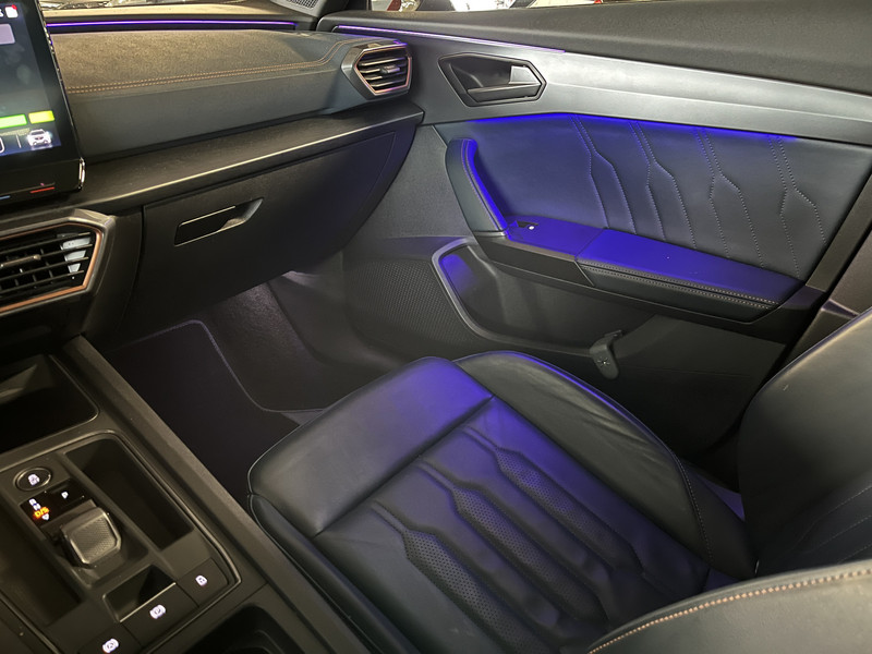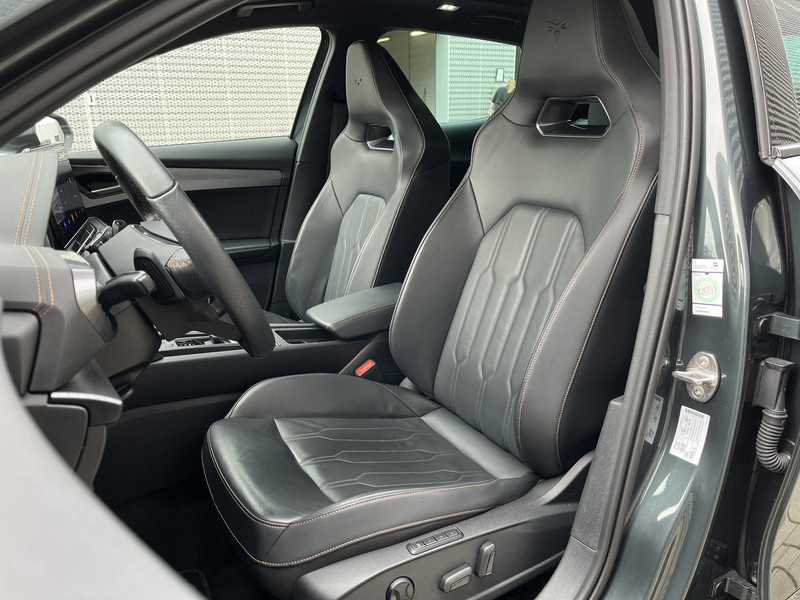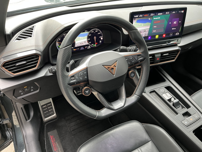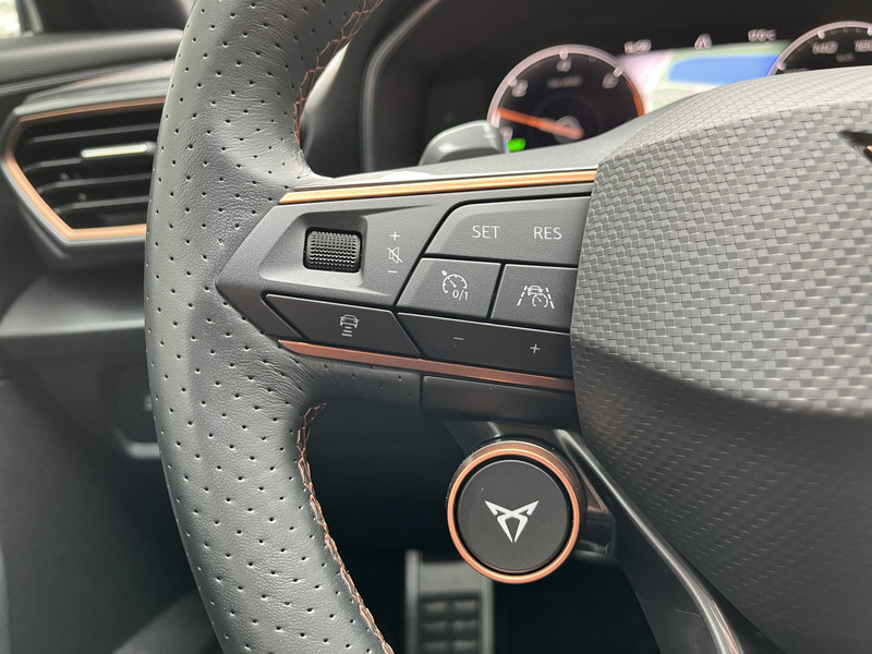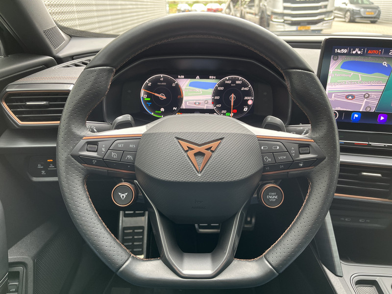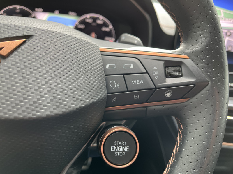 Je leest alle belangrijke functies helder af dankzij het digitale dashboard. De achteruitrijcamera brengt precies in zicht wat zich achter je bevindt en toont een glashelder beeld op hoge resolutie. Een geluidssignaal waarschuwt hoeveel ruimte je nog hebt. Adaptive cruise control is een comfortabele en veilige optie. Het systeem reguleert de snelheid en houdt automatisch afstand tot jouw voorligger. De aanwezige file assistent meet de afstand tot je voorligger en zorgt voor een veilige afstand. Staat het voor je opeens stil? Dan zorgt het systeem dat de auto ook stopt. De bediening van het audio-installatiesysteem en het full map navigatiesysteem gebeurt met knoppen op het stuur en als je wilt zelfs met jouw stem. De audio is overigens voorzien van DAB-radio voor een altijd heldere ontvangst. De uitrusting van deze CUPRA is met achteropkomend verkeer waarschuwing, automatische airconditioning, schakelpaddles aan het stuur, draadloos opladen, regensensor en keyless entry behoorlijk compleet.