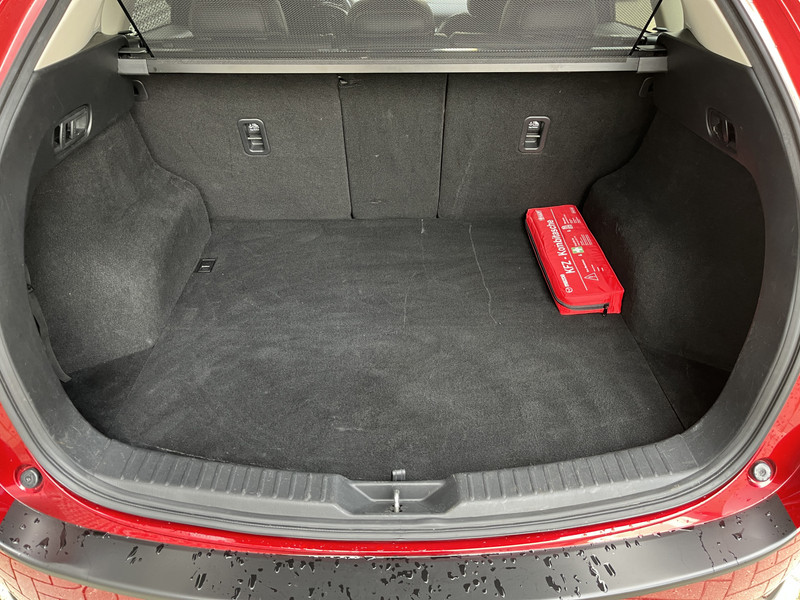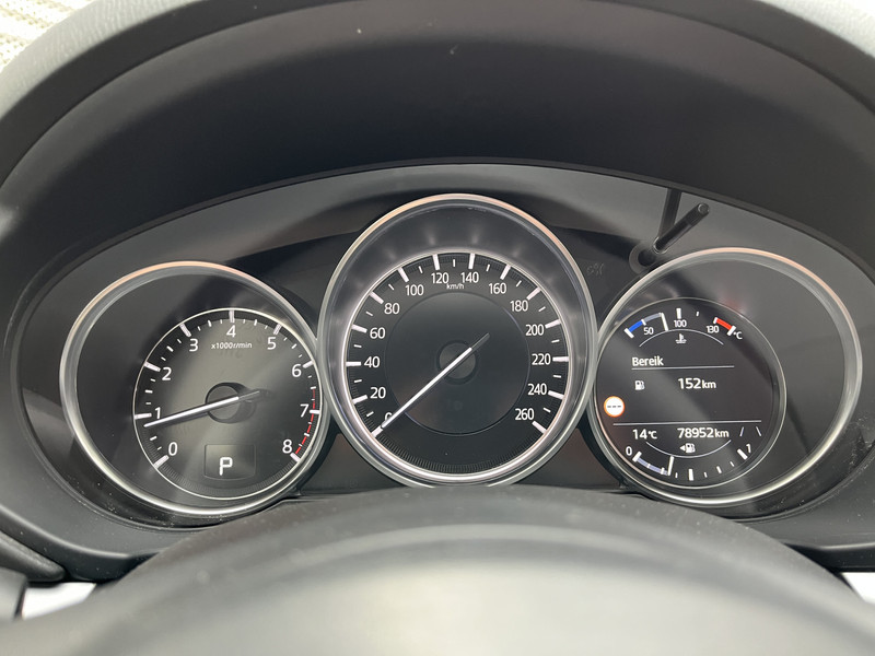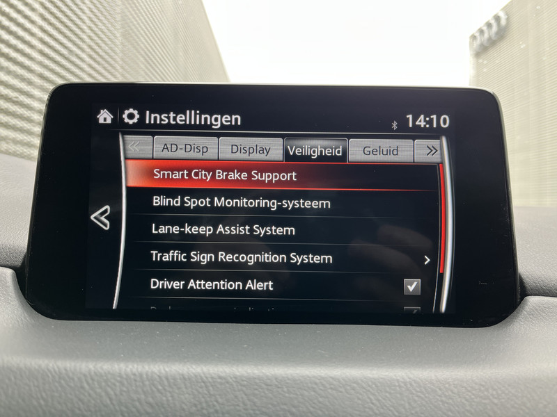 Zoals je mag verwachten van deze Mazda CX-5 is hij uitgerust met een reeks aan actieve veiligheidssystemen. In het instrumentarium kun je bovendien de verkeersborden zien die je onderweg tegenkomt. Zo helpt deze Mazda jou om veiliger te rijden. Het Lane-keeping systeem registreert permanent of je binnen de lijnen van de rijstrook blijft; dwaal je onbedoeld af, dan waarschuwt het systeem en corrigeert de koers. De actieve dodehoekdetectie voorkomt dat je een voertuig over het hoofd ziet en waarschuwt tijdig. De veiligheid van deze auto wordt verder verhoogd door head-up display, driver alert systeem, forward collision warning system, hill hold functie, brake assist en vermoeidheidsherkenning.