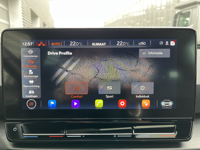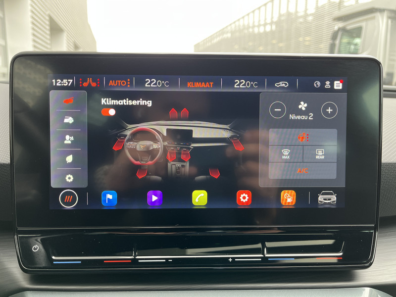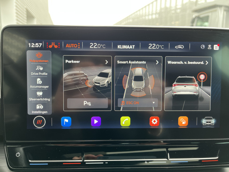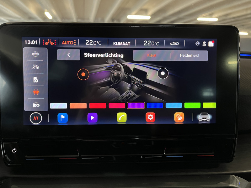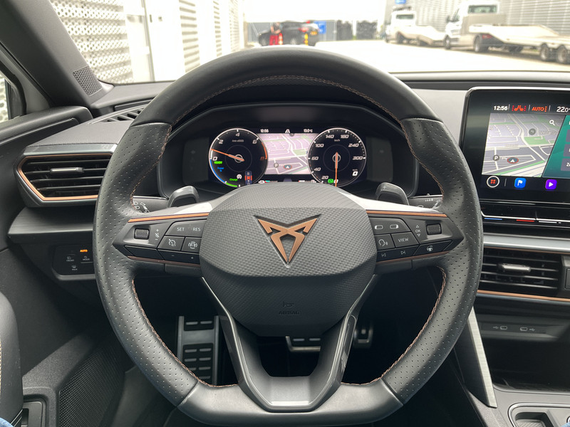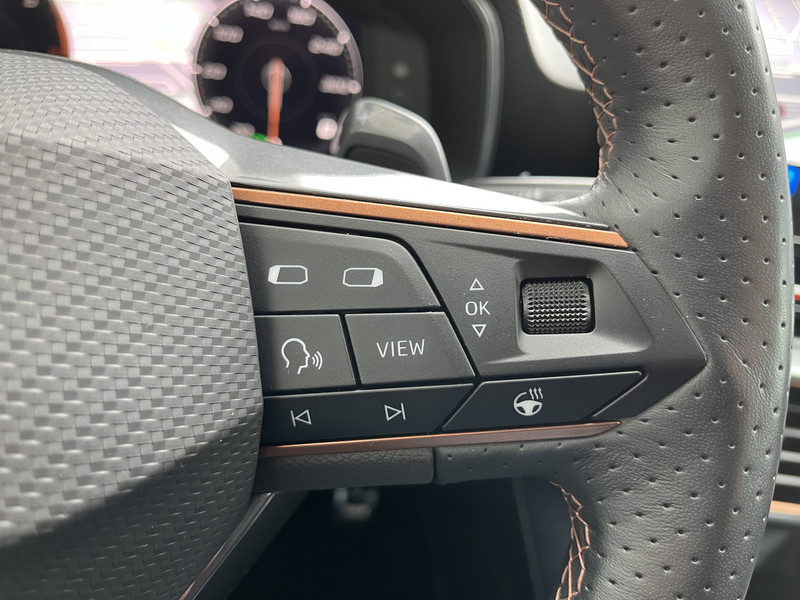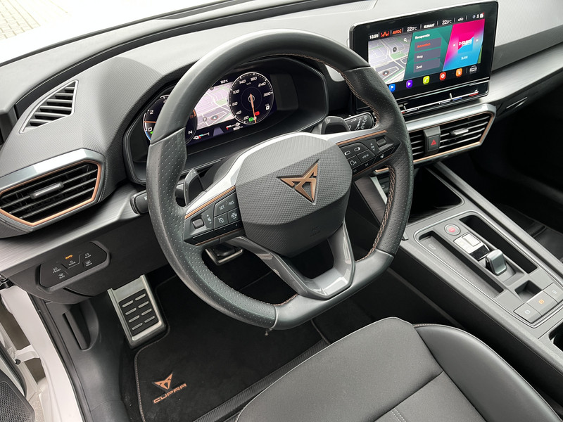 Alle ritinformatie en communicatie is gebundeld in één overzichtelijk digitale dashboard. Kop aan kont langzaam rijden: dan is afstand houden soms lastig. De file assistent helpt en zorgt automatisch voor veilige ruimte tot de voorligger. Ook als die tot stilstand komt. Het full map navigatiesysteem en het audiosysteem (met DAB-ontvangst!) bedien je met knoppen op het stuur of met gesproken commando's. Onderweg laadt u uw smartphone snoerloos op met behulp van de draadloze oplaadmogelijkheid voor telefoons. Ook over je schouder zie je onderweg niet alles wat er aan de achterzijde gebeurt. Daarom heeft deze CUPRA Leon Sportstourer een achteropkomend verkeer waarschuwing. De uitrusting van deze CUPRA is met WIFI-hotspot, electronic climate control, schakelpaddles aan het stuur, parkeersensoren achter, regensensor en cruise control behoorlijk compleet.