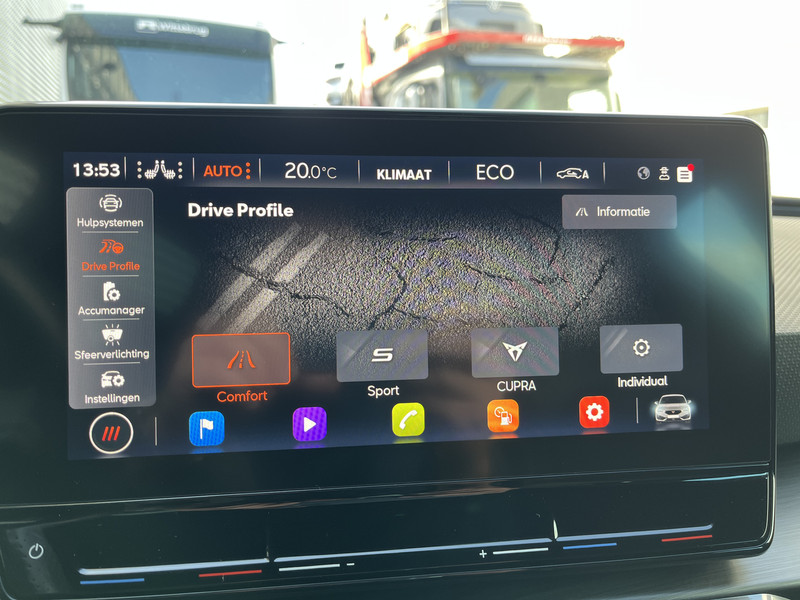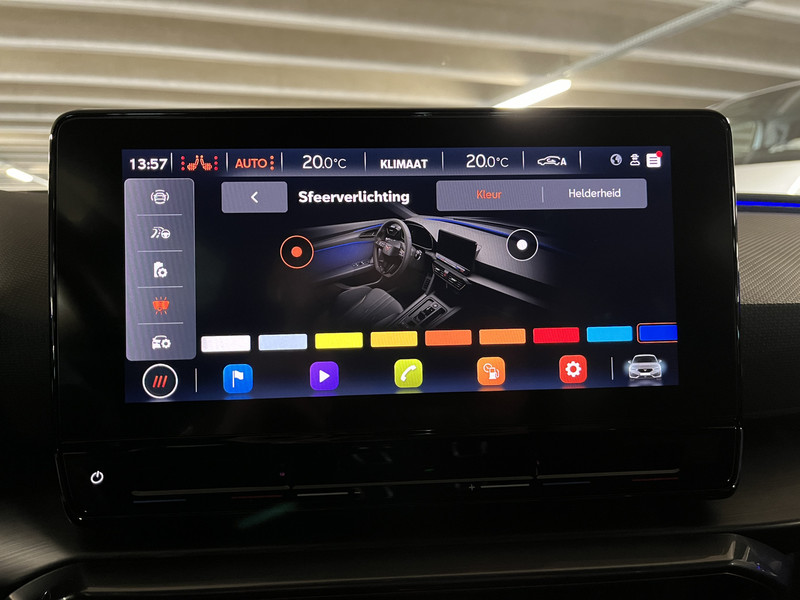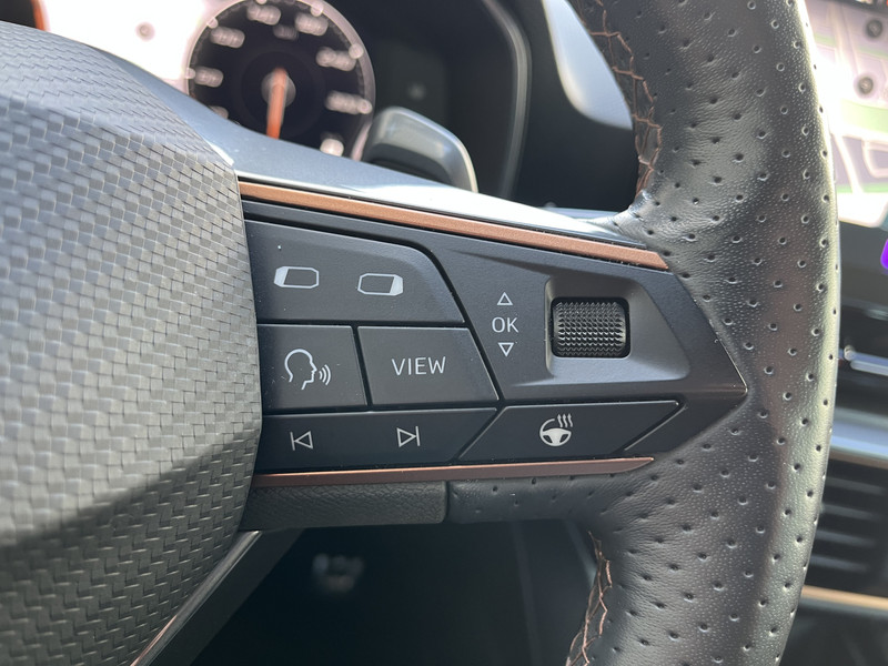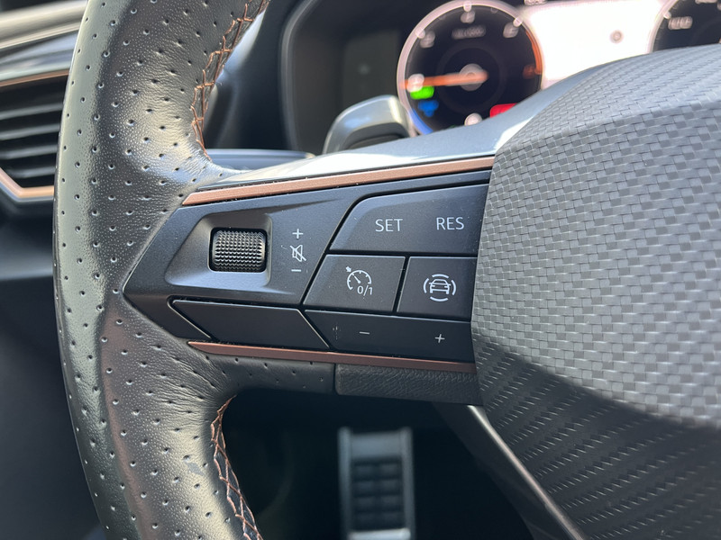 Het digitale dashboard rekent mee, denkt mee en rijdt mee. Alle info overzichtelijk in beeld, overal. Ongelukken of parkeerschade? Dat gebeurt je niet meer, met de achteruitrijcamera. In de file rijden vreet concentratie. Daarom komt de file assistent te hulp om veilig afstand te houden en automatisch te stoppen als je voorligger stilstaat. Een optie die de veiligheid verhoogt, is de bediening vanaf het stuur van het audiosysteem (met DAB-radio!) en het full map navigatiesysteem. Als je wilt kun jij beiden zelfs met je stem bedienen. Nieuwe smartphones hebben geen snoeren meer nodig om op te laden. Daarom heeft deze CUPRA Leon een draadloze oplaadmogelijkheid voor telefoons waarmee je onderweg simpel en effectief voor een volle accu zorgt. De uitrusting van deze auto is met WIFI-hotspot, electronic climate control, regensensor, cruise control, sportstuurwiel en keyless entry behoorlijk compleet.